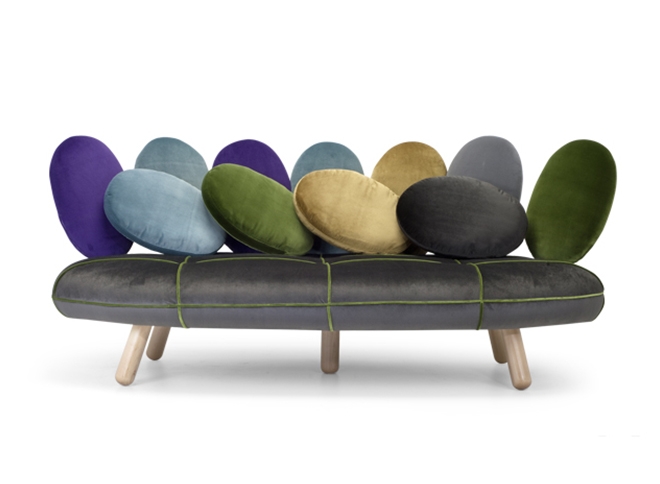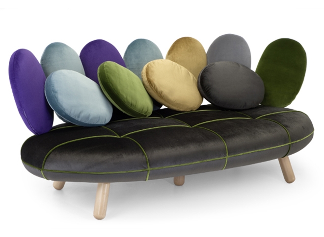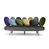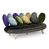 Curved plywood structure padded with plyurethane and fiberfill. Legs in beech wood. Fireproof on demand.
