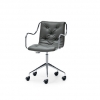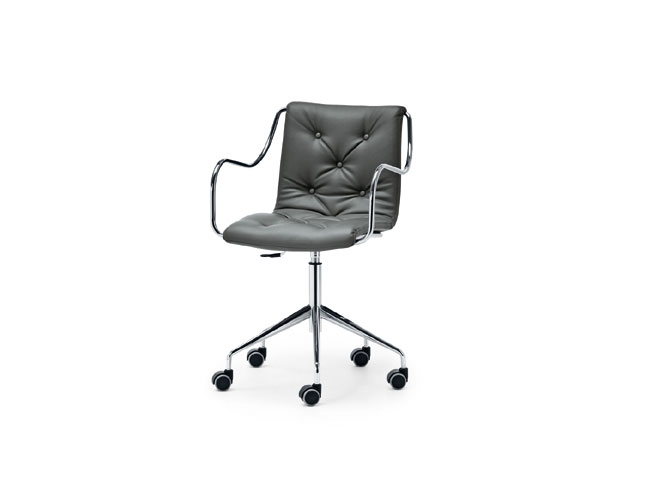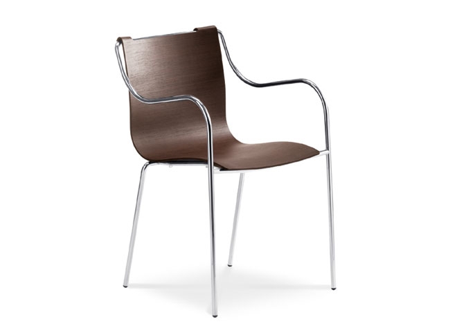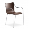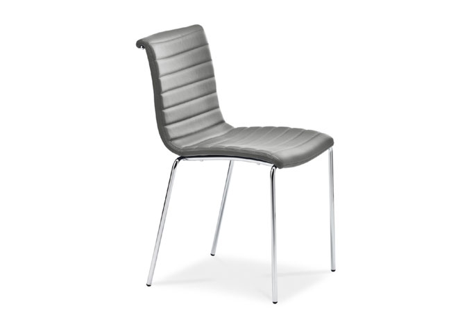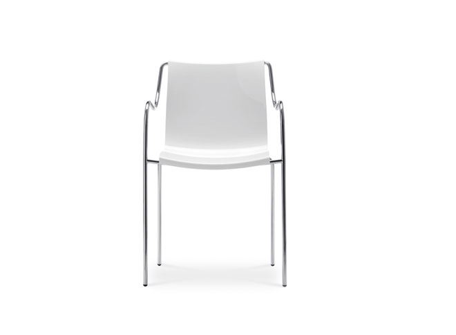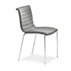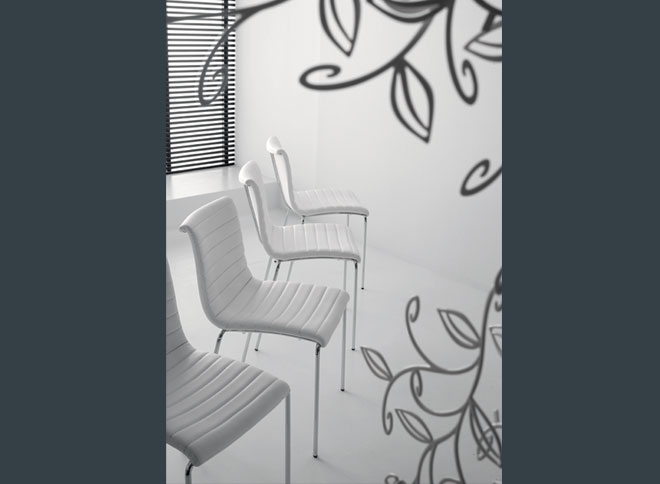 Disponibile con struttura in metallo cromato, verniciato alluminio o bianco, seduta in policarbonato liscio, precomposto rovere moro o naturale pelli, ecopelli, tessuti.